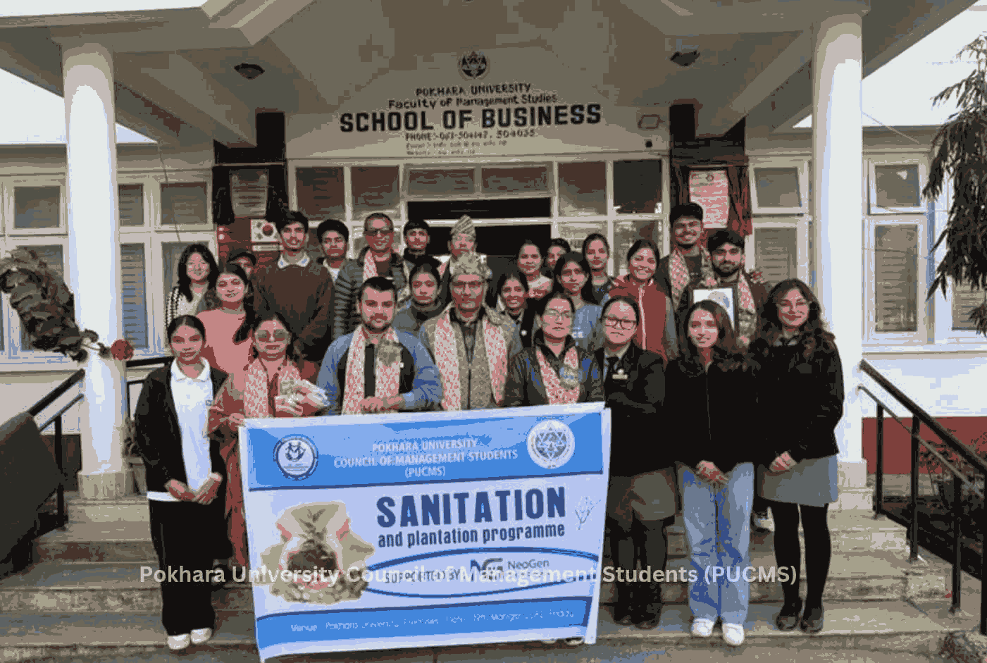 On Mangsir 19, the Pokhara University Council of Management Students (PUCMS) conducted a Sanitation and Cleanliness Program at the Pokhara University premises on the occasion of World Soil Day and International Volunteer Day, under the chairmanship of President Mr. Rajan Paudel. PUCMS members cleaned university corridors and surrounding areas and planted flowers in front of the School of Business garden, promoting environmental responsibility and a cleaner academic environment. The program was honored by the presence of Chief Guest Dr. Rabindra Ghimire, Associate Professor and Club Advisor, along with faculty members, administrators, alumni, and sponsors. The event concluded with appreciation for all members and volunteers whose efforts contributed to the successful completion of the program.