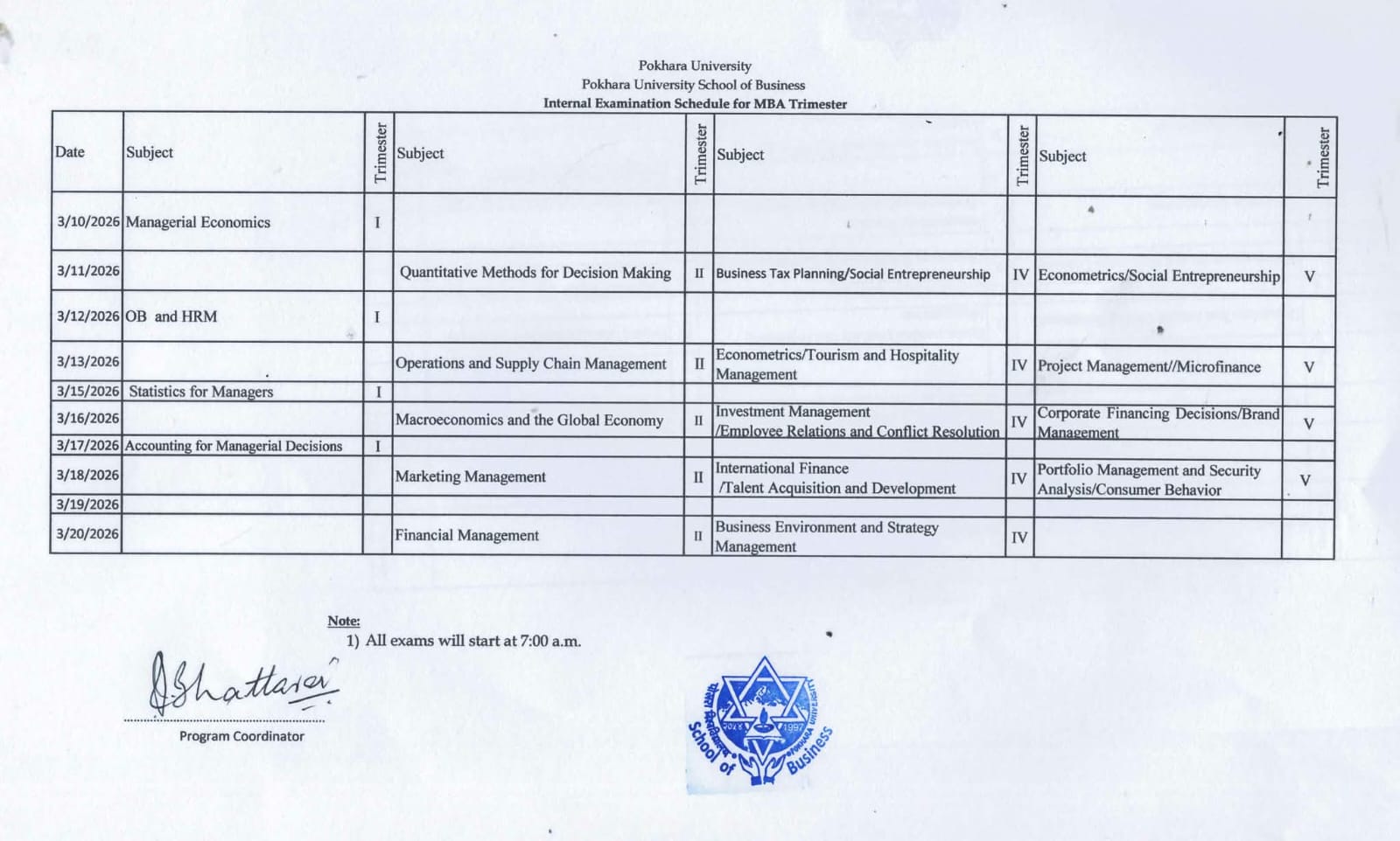 MBA Internal Exam Schedule 2025 Fall