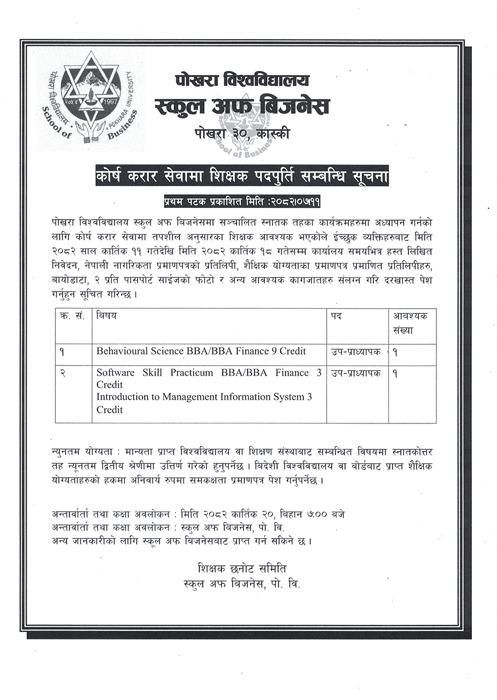 कोर्ष करार सेवामा शिक्षक पदपुर्ति सम्बन्धि सूचना